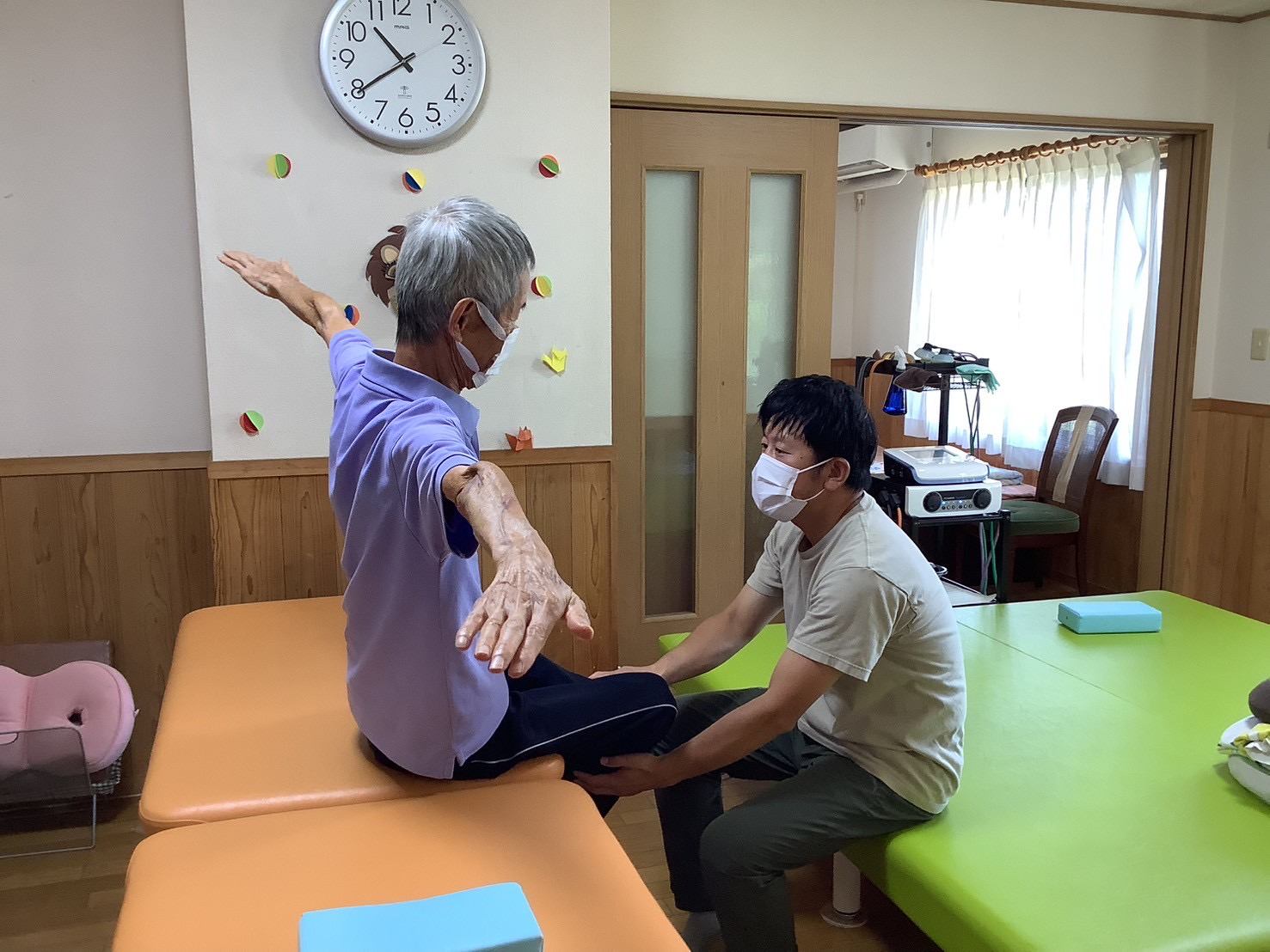 利用者さまの体を触診し、会話を重ねながら状態を確認し、その方に合った施術を行います。スタッフの優しい声かけと経験に基づいた手技により、安心して体を任せられる雰囲気が広がっています。